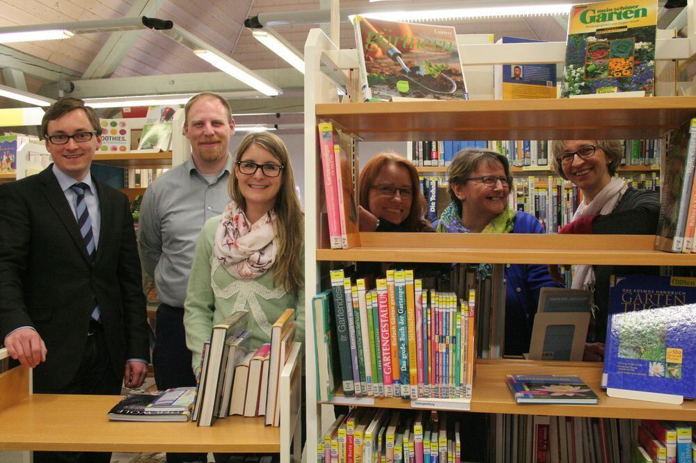 Bürgermeister Steffen Heß, Andreas Linsenmayer vom Bauamt, Hauptamtsleiterin Saskia Brendle, Karin Föll, Inge Ott und Martina Hanisch von der Bücherei freuen sich schon auf die neuen Räumlichkeiten in der Schloss-Scheuer. Derzeit sind sie noch in der alten Bibliothek mit Umzugsplänen beschäftigt. GEA-FOTO: IWA