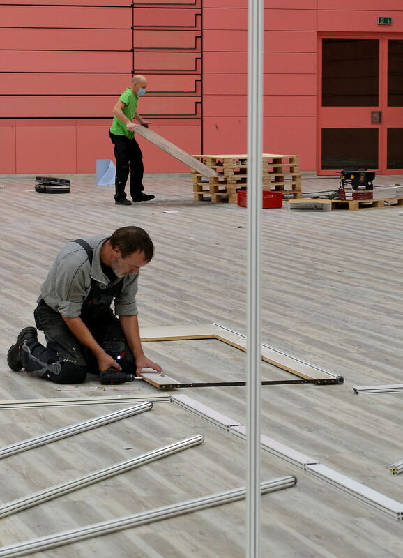 Maßarbeit in der Halle. Bis Sonntag soll bei der Möblierung alles fertig sein in der Tübinger Paul-Horn-Arena. FOTOS: NIETHAMMER