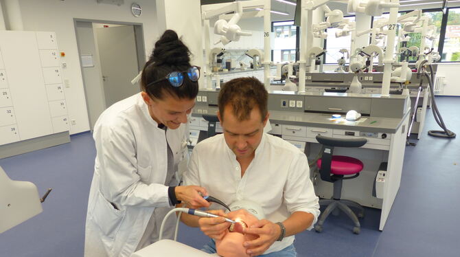 Oberärztin Dr. Andrea Klink demonstriert mit Zahntechnikermeister Benjamin Votteler, wie die Studierenden an Phantomköpfen das Präparieren eines Zahnes trainieren.