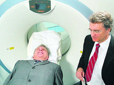 Der Minister liegt Probe: Ernst Pfister (links) und der Leiter der Radiologie, Claus D. Claussen.