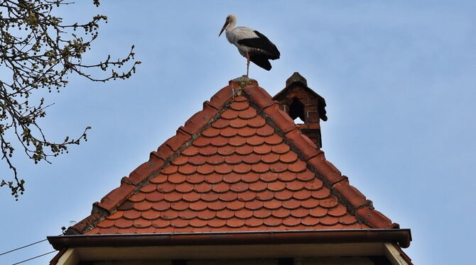 MÖSSINGEN. Hurra, ein Baby ist angekommen. Oder doch nicht? Denn der Klapperstorch auf dem Dachgiebel an der Mössinger Straße ist auf den zweiten Blick kein Pappkamerad, der eine Geburt im Haus anzeigt, sondern ein echter, lebender Großvogel. Zwei Stunden lang hat Meister Adebar auf dem höchsten Gebäude der Umgebung ausgeharrt. Ein sehr seltener Anblick. Es kann sich niemand erinnern, dass sich in Belsens Ortskern jemals ein Weißstorch aufgehalten hat. Auf den Wiesen rund um Mössingen ist er sporadisch bei der Futtersuche zu sehen.