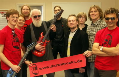 Hansjürgen Dahmen (mit der roten Gitarre) schlüpft im Video in die Rolle von Charles Darwin.