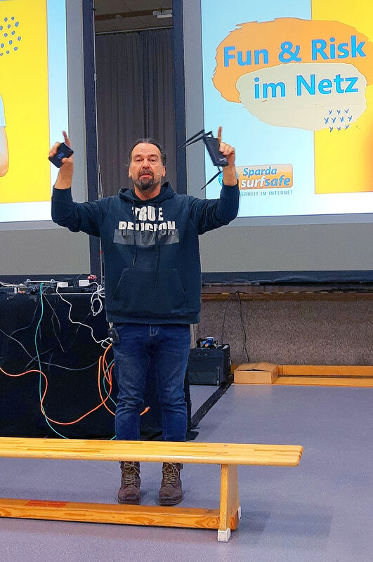 Auftragshacker Erwin Markowsky über Internetsicherheit in der Hermann-Hepper-Halle in Tübingen. FOTO: SCHERTLIN