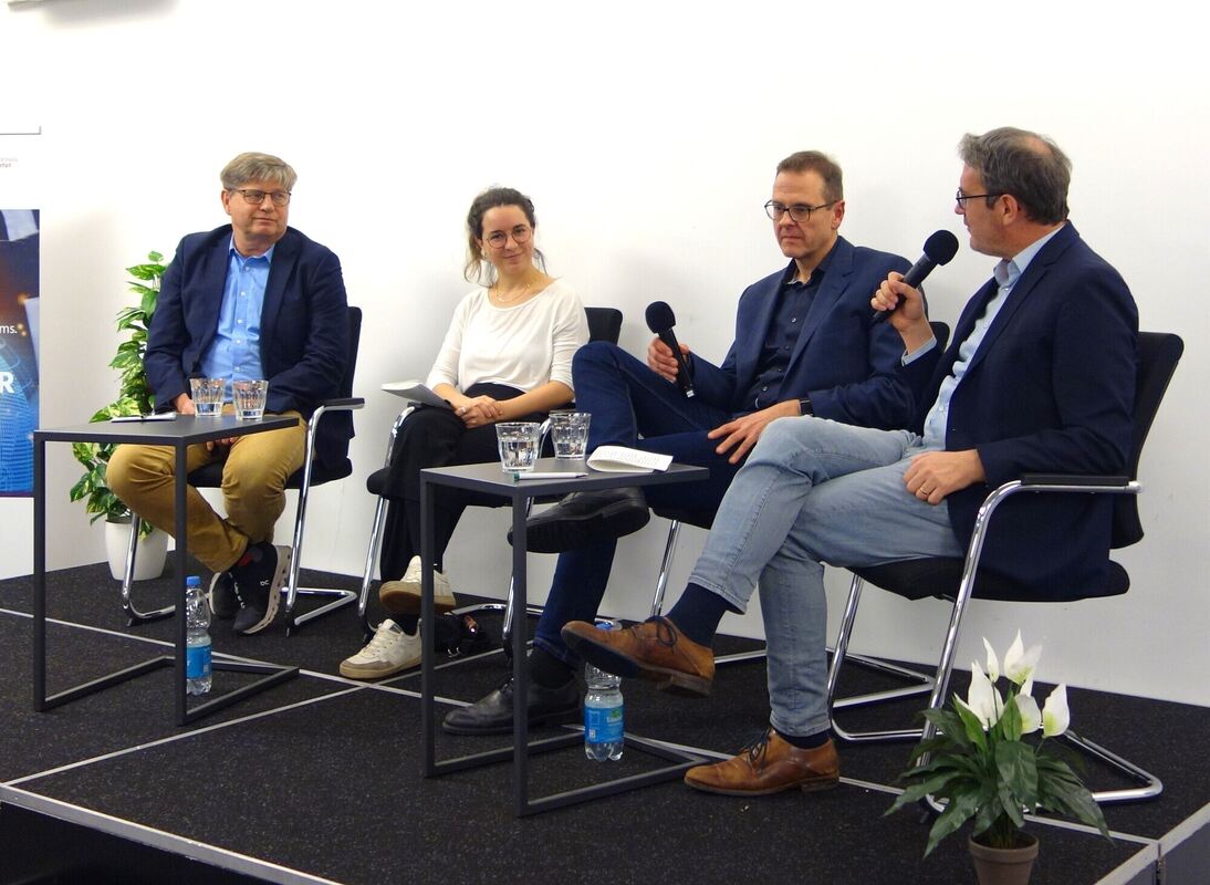 Klaus Gestwa (von links), Elena Riedlinger und Michael Butter im Gespräch mit Christopher Gohl. FOTO: STRAUB