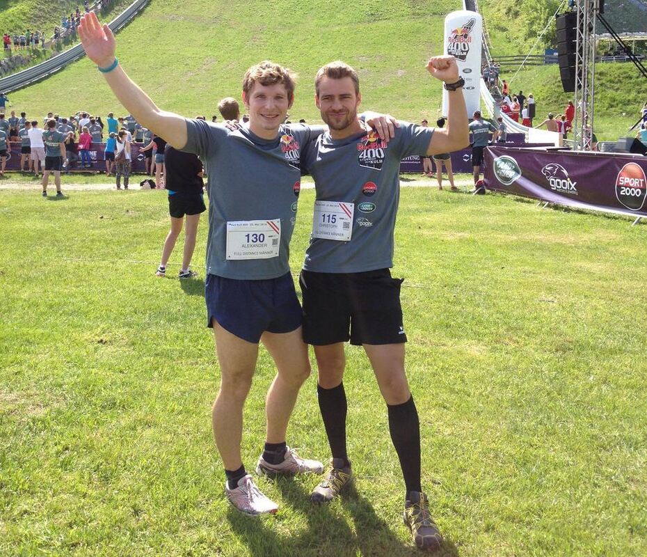 Extremer Lauf: 200 Höhenmeter auf 400 Meter Strecke. Eine steile Skisprung-Schanze ganz hoch. Die drei Triathleten von der LG Steinlach Alexander Görzen (links), Christoph Groß (rechts) sowie Johannes Köhnlein (nicht auf dem Bild) waren beim Red Bull 400 am Kulm in Tauplitz in Österreich dabei. Und sie schafften es sogar mit großer Leistungsfähigkeit auf vordere Plätze. Im Ziel ging dann erst mal gar nichts mehr. Johannes Köhnlein steckte den Kopf ins Wasser, andere lagen völlig abgekämpft am Boden. FOTO: PR