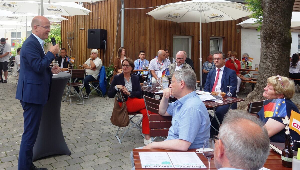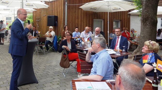 Der Vorsitzende der CDU/CSU-Bundestagsfraktion Ralph Brinkhaus unterstützte die Bundestagskandidatin Annette Widmann-Mauz mit einem Wahlkampfauftritt im Rottenburger Biergarten beim Bürgerwachheim.