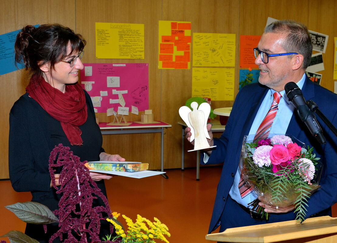 Einen Engel überreichte Norbert Lurz vom Oberkirchenrat Birgit Wahr zu ihrer Einsetzung als Schulleiterin.foto: Niethammer