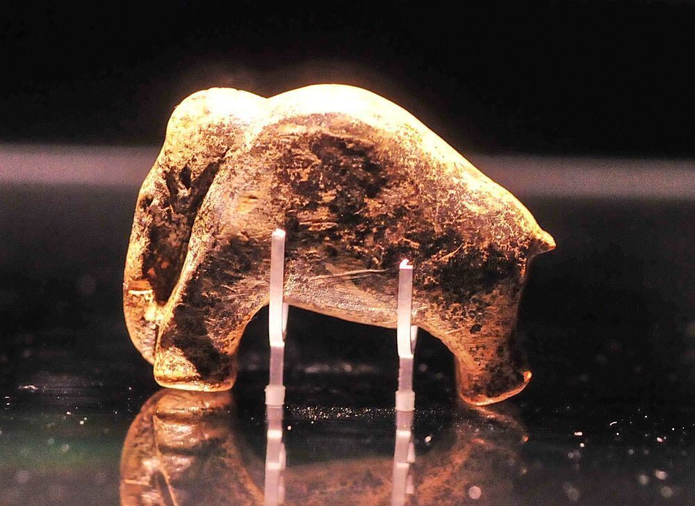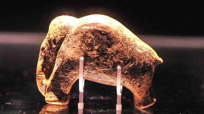 3,7 Zentimeter groß, 7,5 Gramm leicht und mindestens 32 000 Jahre alt: Das kleine Mammut aus Elfenbein war einer der Stars der Eiszeit-Ausstellung in Stuttgart. FOTO: UNI