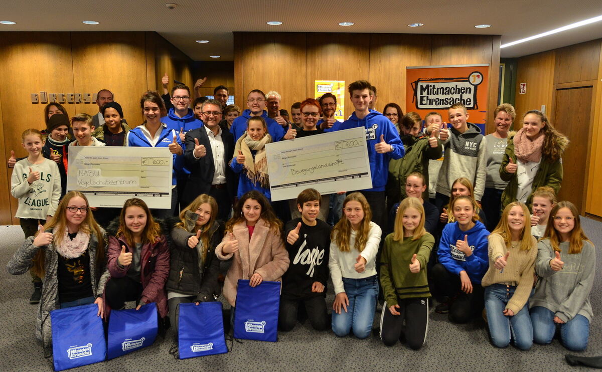Daumen hoch für ein gutes Projekt: An der Aktion »Mitmachen Ehrensache« beteiligten sich rund 50 Schüler und erarbeiteten 1 200 Euro, die gespendet wurden. FOTO: NIETHAMMER