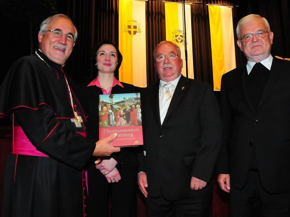 Bischof Gebhard Fürst mit dem neuen Bestandskatalog des Diözesanmuseums, neben ihm Melanie Prange, Wolfgang Urban und Weihbischof Johannes Kreidler. FOTO: BÜHLER