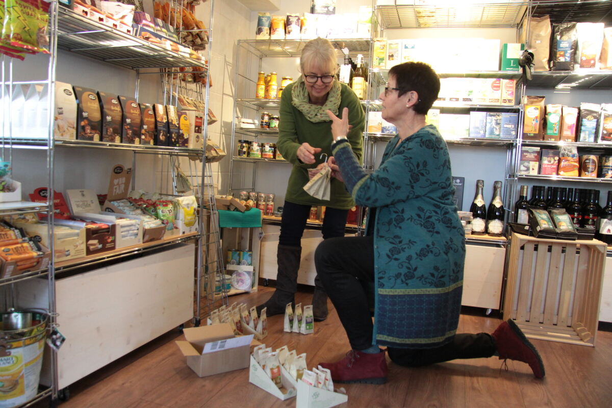 Andrea Walter und Ute Dürr räumen noch ein, vervollständigen die Regale, etwa die Gewürze. Ute Dürr ist in Mössingen »Mutter der Bewegung«, ist schon so lange dabei, wie es diese gibt. Andrea Walter ist seit sieben Jahren im ehrenamtlichen Team, seit es den Weltladen in der Kirche gab. Nun bieten die neuen Räumen unter anderem auch Platz für die faire und biologische Kinderkleidung, angeboten in Kooperation mit dem Reutlinger Geschäft »better2gether«. Platz ist zudem für handwerklichen Silberschmuck. Natürlich sind auch die Weltladen-Klassiker wie Kaffee oder getrocknete Mangostreifen im Angebot, zudem Schokolade, Honig, Weine und Rum.