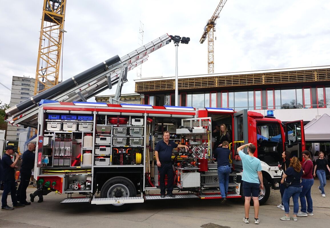 Kommandant Markus Appenzeller (Bildmitte) zeigte das neue Kirchentellinsfurter Feuerwehrfahrzeug, das vor allem für technische Hilfeleistung ausgelegt ist. FOTO: STRAUB