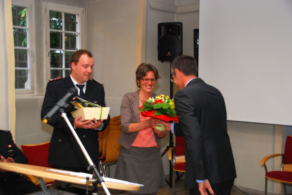 Ein Geschenkkorb für den scheidenden Kommandanten, Blumen für seine Frau Karin, übergeben von Bürgermeister Bernd Haug. FOTO: EBER