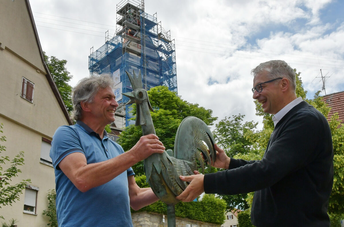 Der Finder Manfred Thiel übergibt Pfarrer Joachim Rieger (rechts) den gestohlenen Hahn von der Peter-und-Paulskirche. FOTO: MEYER