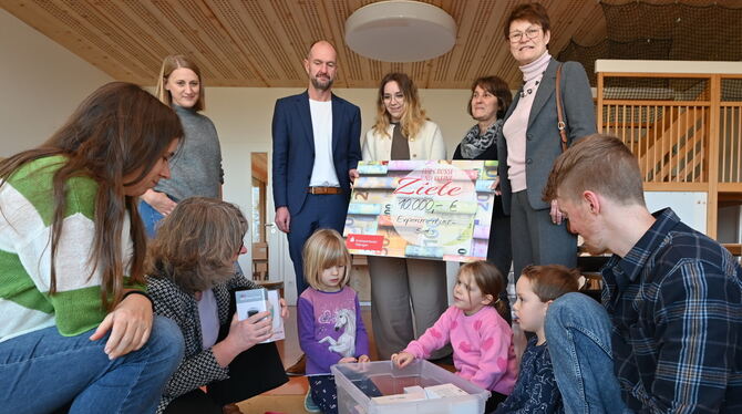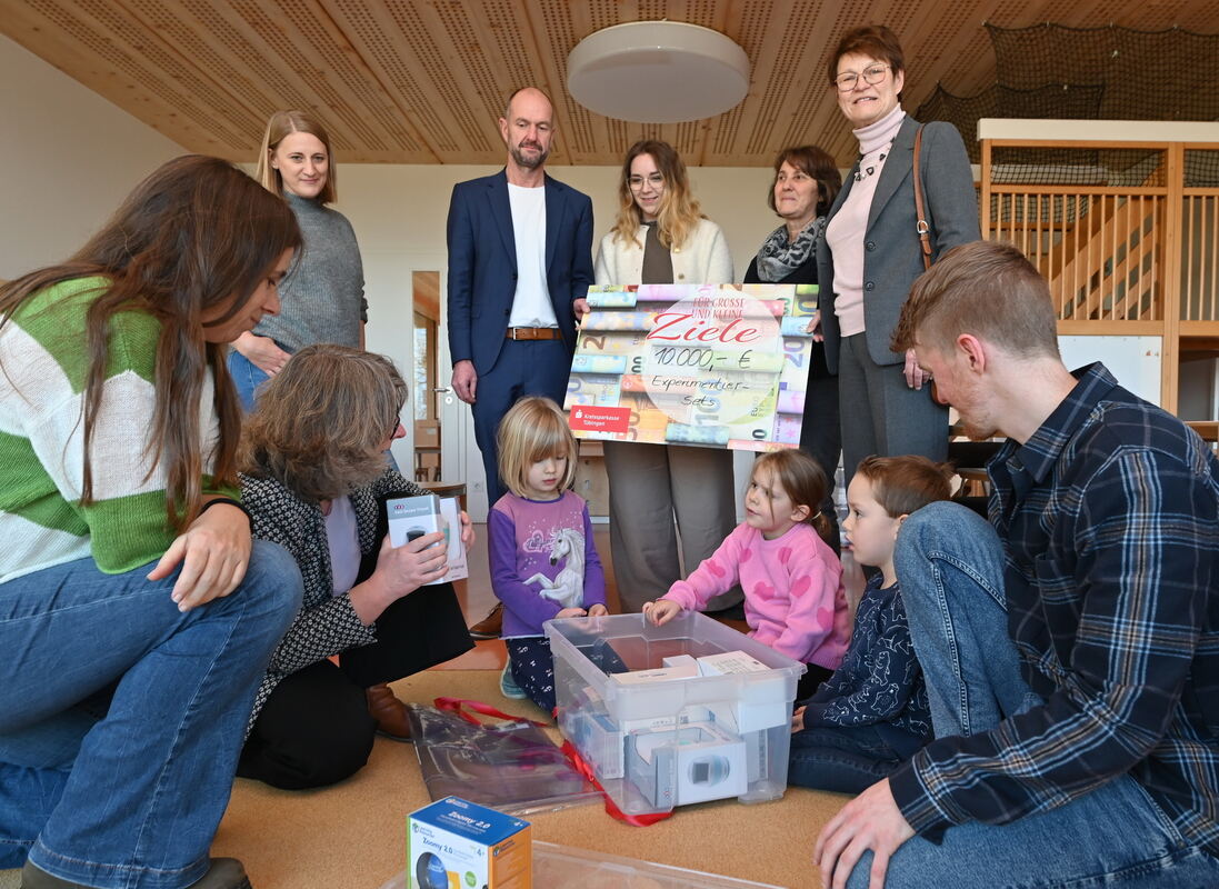 MÖSSINGEN. Die Redewendung »Das Leben ist ein Nehmen und Geben«, könnte auch als Motto für die Kreissparkasse Tübingen stehen. Das größte Geldinstitut im Kreis hat in den Mössinger Kindergärten für eine vorgezogene Bescherung gesorgt. Zehntausend Euro spendete die Bank den 14 Einrichtungen im Stadtgebiet. Nicht in bar, sondern in Form von Spielkisten. Genauer gesagt in Experimentier-Kisten. Mit deren Inhalt sollen die Kleinen fit für die digitale Welt von Morgen gemacht werden. Legosteine und Bauklötze bekommen also Konkurrenz. Bei der stellvertretenden Übergabe für alle Einrichtungen im Kinderhaus Otto-Merz-Straße packten drei Bewohner zusammen mit Kinderhaus-Leiter Lukas Flach und Familien- und Bildungsleiterin Anja Streck eine Kiste mit Spannung aus: Naturwissenschaftliche und sprachfördernde digitale Spielzeug-Sets in Form von WLAN-Mikroskopen und Programmier-Tastaturen.