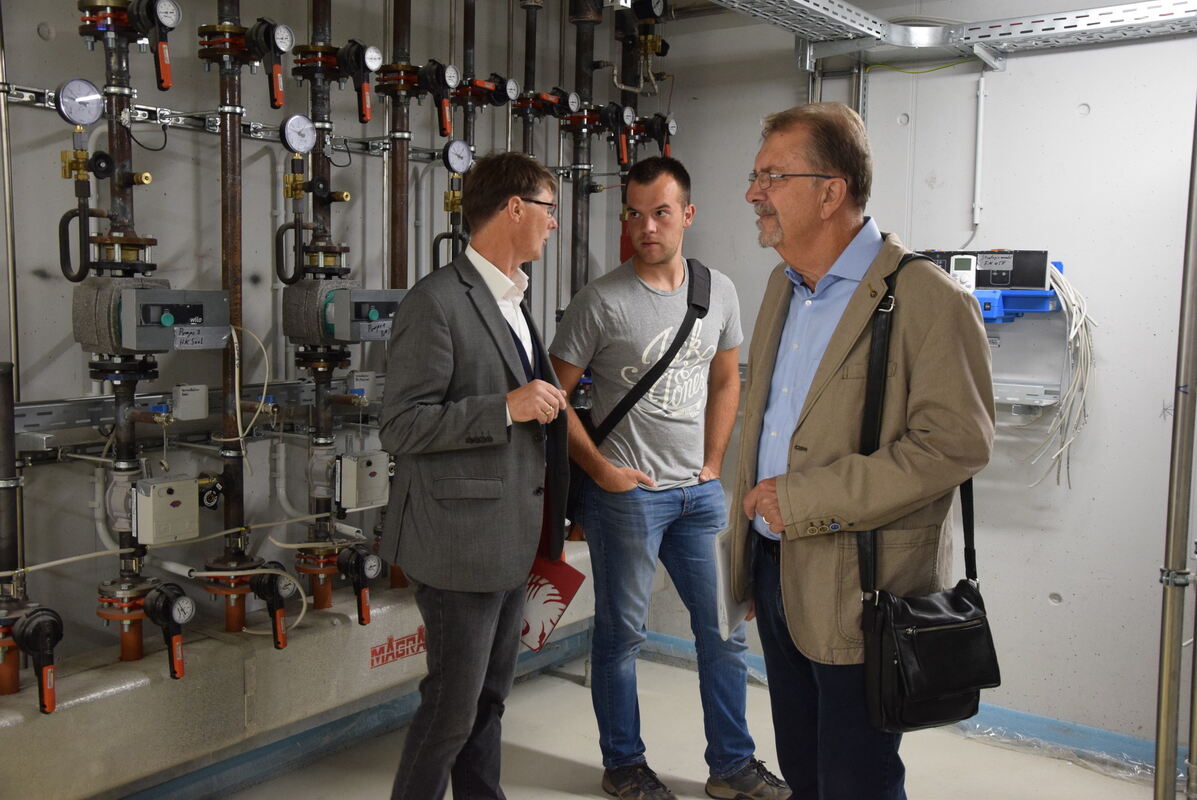 Die Technikzentrale des Dienstleistungszentrums steht, die künftigen Büroräume sind schon zu erkennen. Architekt Albert Hörz (links im Gespräch mit Gemeinderat Martin Kuttler) führte die Mitglieder des Gomaringer Bauausschusses durch die Kindlersche Fabrik.