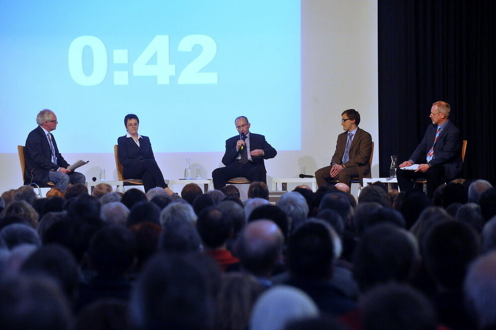 Die Zeit läuft: Für die Beantwortung der Fragen der GEA-Redakteure Joachim Kreibich (rechts) und Philipp Förder (links) hatten Petra Rupp-Wiese, Dietmar Bez und Steffen Heß (von links) jeweils 90 Sekunden Zeit. Das war manchmal ziemlich knapp.