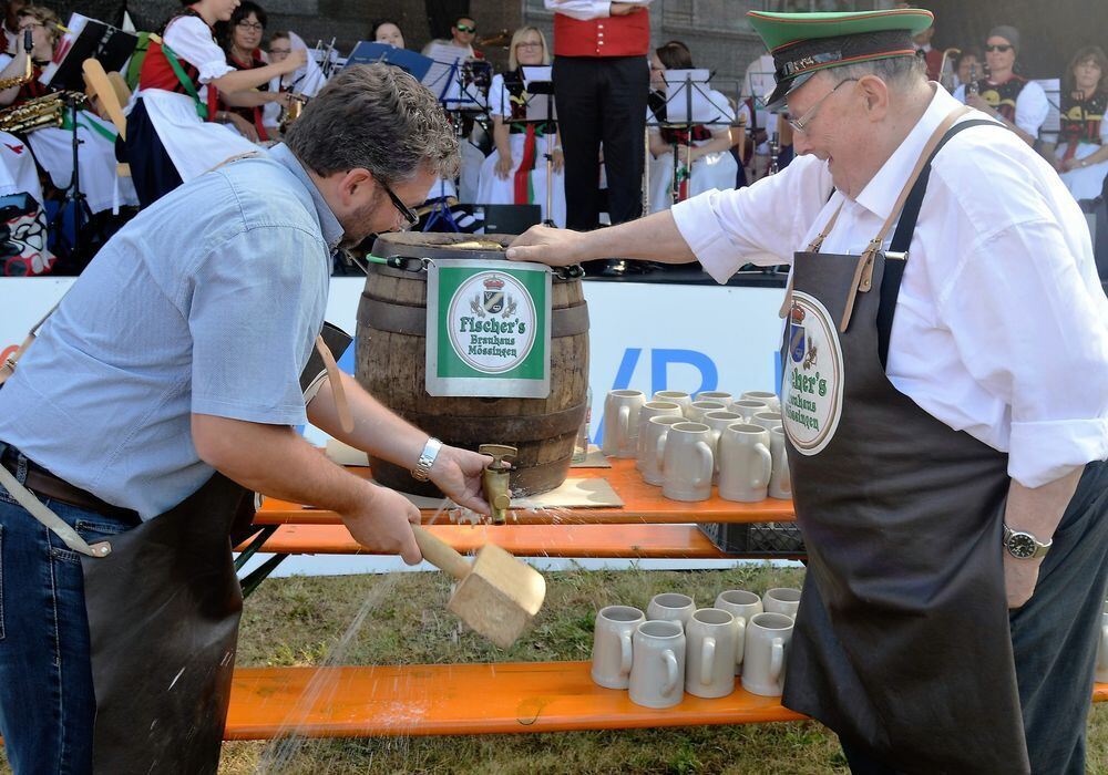 Gelungener Fassanstich durch Mössingens OB Michael Bulander und Braumeister Heinrich Fischer. FOTO: BIRGIT VEY