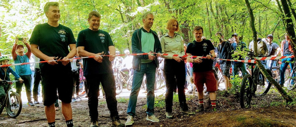 Beim Durchschneiden des Bandes (von links): Michael Rühle (Vorsitzender RV Pfeil), Thomas Heiner (DAV Tübingen), OB Boris Palmer, Stefanie Kuppe (Bundesforstbetrieb), Chris Mirke (Trailwart). FOTO: SCHERTLIN
