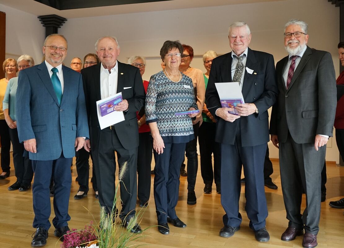 Ehrungsmatinee des Chorverbands Ludwig Uhland, Bezirk Steinlach-Härten-Wiesaz, im Festsaal der Ofterdinger Zehntscheune (von links): Vorsitzender des Sängerbezirks Steinlach-Härten-Wiesaz Waldemar Koitsch, Albert Steinhilber (60 Jahre Sänger beim Liederkranz Talheim), Erika Birkenmaier (50 Jahre im Bürgergesangverein Ofterdingen), Hans-Jürgen Boldt (50 Jahre beim Liederkranz Talheim) und Laudator Eberhard Wolf vom Chorverband Ludwig Uhland. FOTO: STRAUB