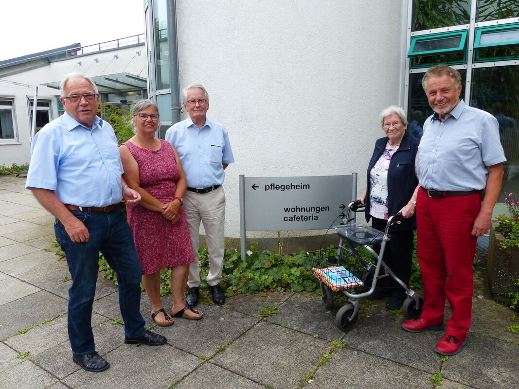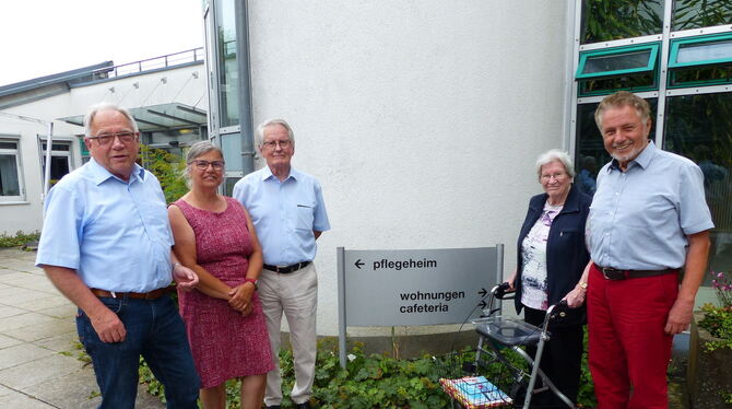 Die Cafeteria könnte mit einem größeren Pool an Helfern öfter betrieben werden (von links): Dieter Kress, Einrichtungsleiterin Elisabeth Armbruster, Siegfried Kirschbaum, Bewohnerin Mina Kleeblatt und der Vorsitzende des Freundeskreises, Bernhard Knauss. FOTO: WEBER