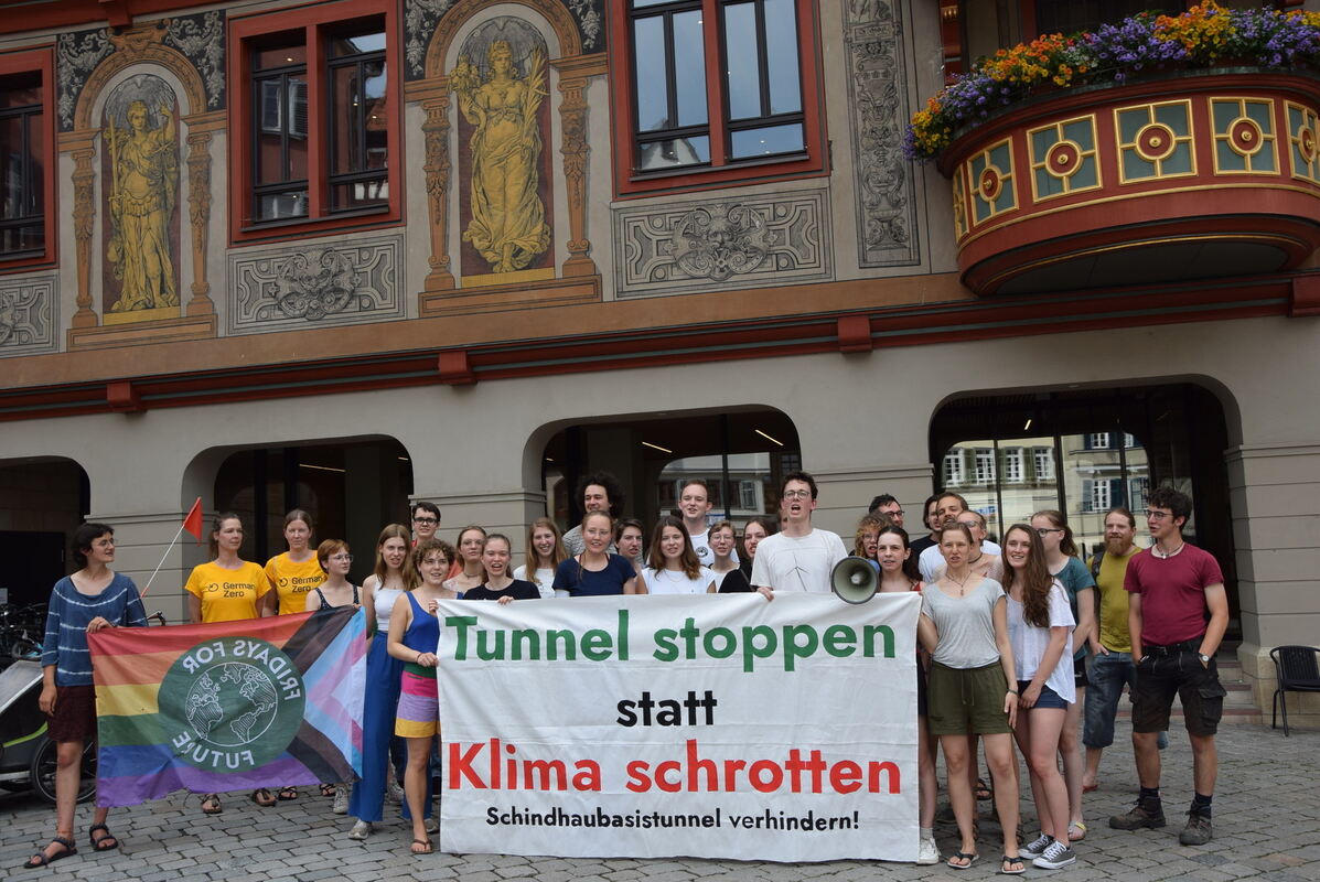Die Klimaschützer zeigten damit ihre Unterstützung für einen Antrag, den der Jugendgemeinderat vor Kurzem gestellt hat. Er soll im Juli im Ratssaal beraten werden und wendet sich gegen den vierspurigen Ausbau der B 27 und insbesondere den Schindhau-Basistunnel zwischen Bläsibad und Knoten mit der B 28.