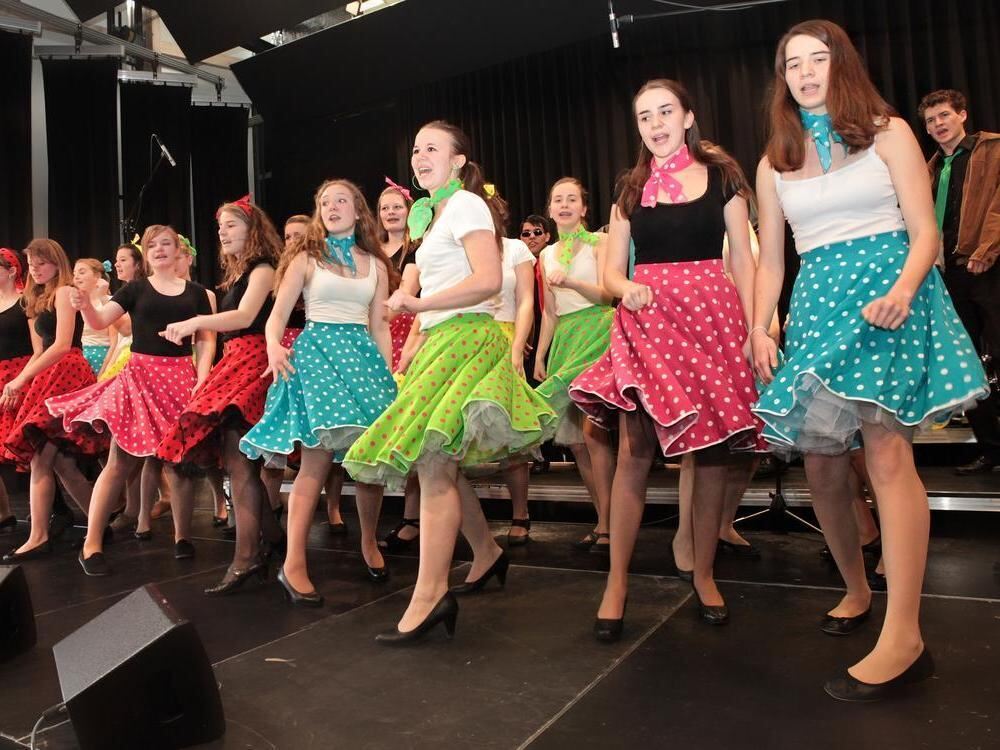 Mädchen vorne im feschen Pünktchen-Rock, Jungs dahinter in der coolen Lederjacke – alles mit dem Charme der 1950er-Jahre: Bei der Orchester-Matinee in der Gomaringer Kulturhalle begeisterte der Jugendchor Vocal Freestyle des Gesangvereins Harmonie.