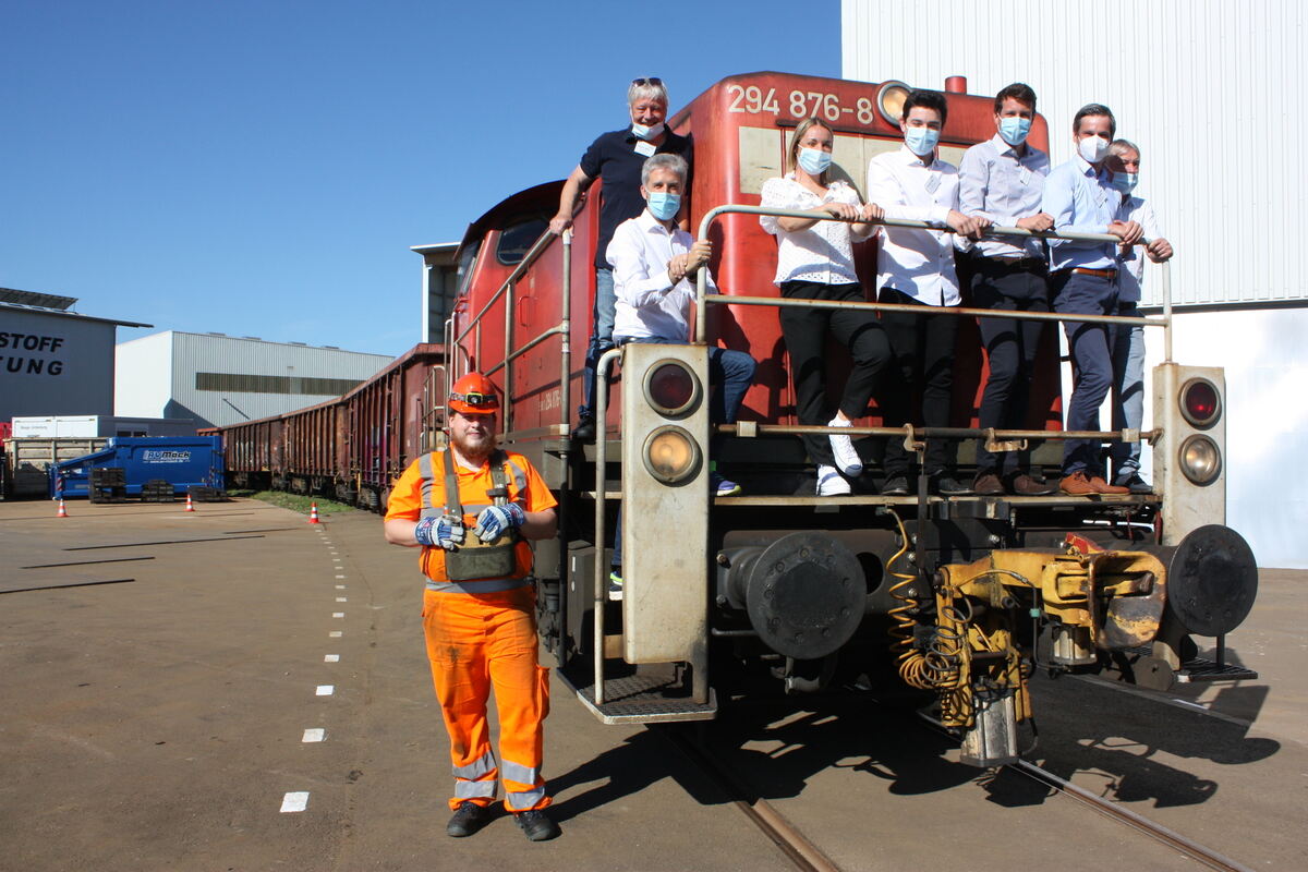 Mehrere Generationen Möck freuen sich zusammen mit Oberbürgermeister Boris Palmer (oben, vorn links) über die Wiederaufnahme des Rangierdiensts. Stehend links: Lokrangierführer Tino Lessig. FOTO: STURM