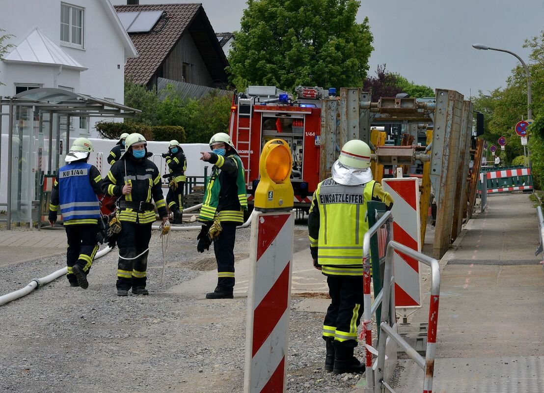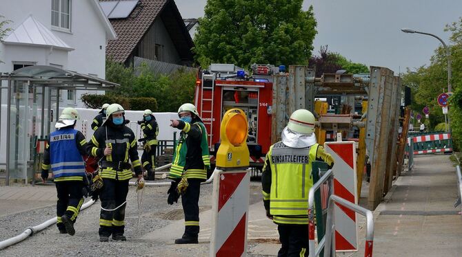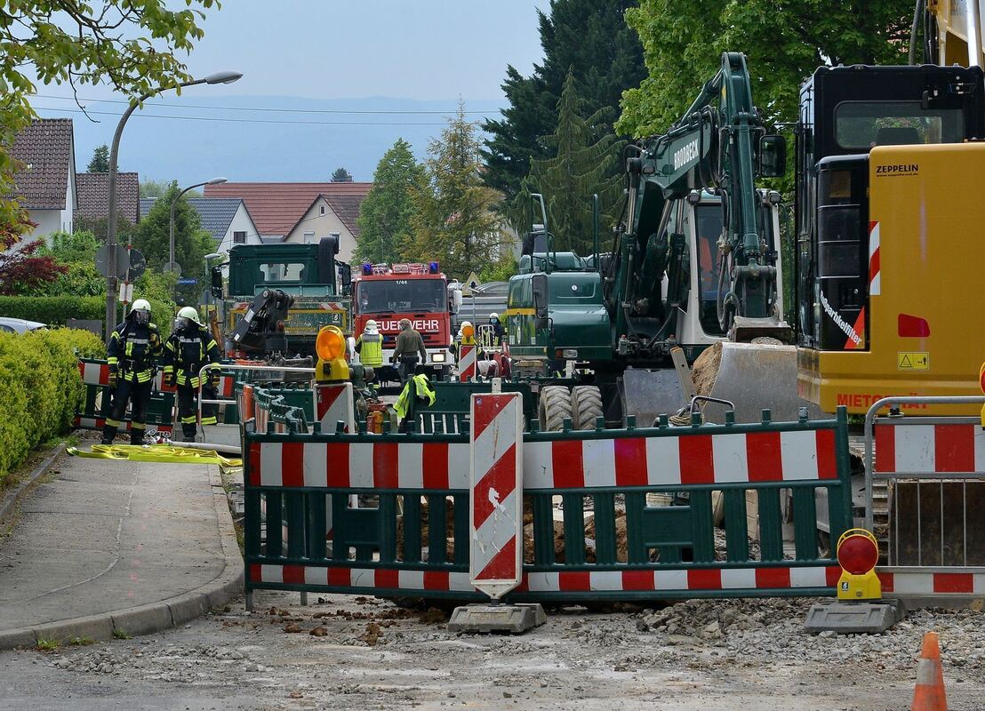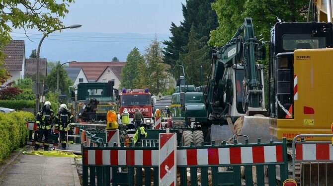 KUSTERDINGEN. Weil ein Bagger bei Bauarbeiten in der Mozartstraße die Hauptgasleitung erwischt und ein Leck gerissen hatte, mussten gestern Nachmittag gegen 17 Uhr sechs Gebäude um die Austrittsstelle durch die Feuerwehr evakuiert werden. Fair-Energie-Mitarbeiter hatten das Loch eine Dreiviertelstunde später mit Schiebern vorläufig abgedichtet.