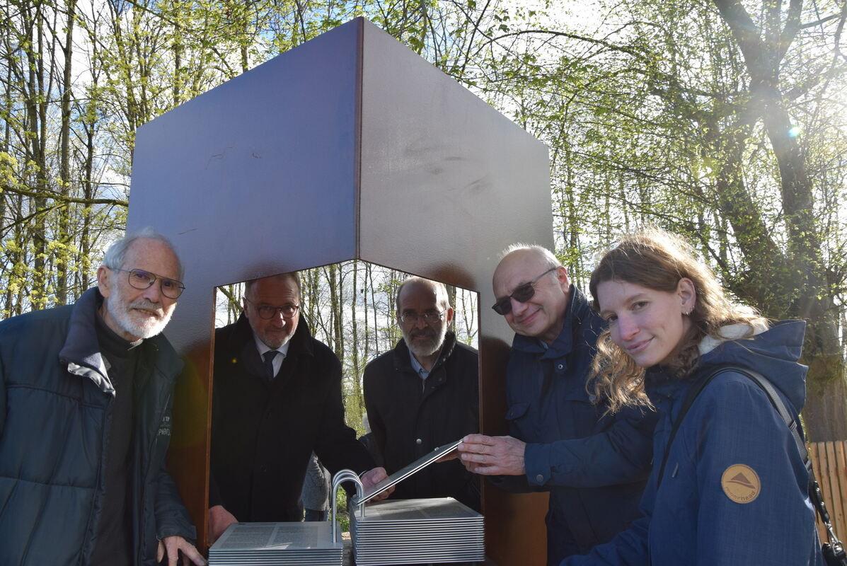 Von links: Künstler Jochen Meyder, Landrat Joachim Walter, Kusterdingens Bürgermeister Jürgen Soltau, Kreisarchivar Wolfgang Sannwald und Jugendguide Anna Pytlik bei der Einweihung des Gedenkbuchs.