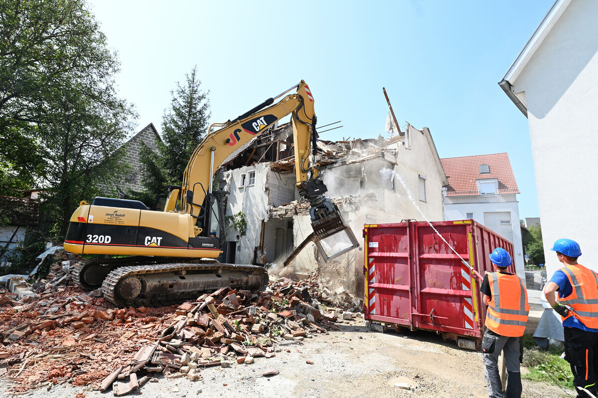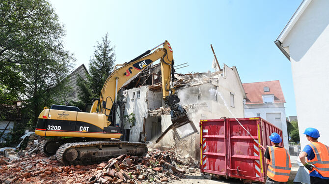 Man habe Glück gehabt, dass sich mit der Abrissfirma Rudolph aus Oberstetten ein Unternehmen fand, das sich am Mittwoch gleich den Schaden ansehen und gestern Morgen mit dem Bagger anrücken konnte, sagt Ortsbaumeister Oliver Polzin. Das Haus wurde so weit abgebrochen, dass es keine Gefahr mehr darstellt und ein Teil des Materials ist auch schon entsorgt. Der Rest erfolgt dann mit der Umsetzung des neuen Projekts an der Stelle. (GEA)