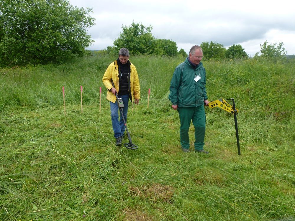 Holger Kiehl (links), der die Bauaufsicht hat, und Räumstellenleiter Torsten Merz demonstrieren, wie der Boden am Stadtrand von Tübingen mit speziellen Geräten nach Hinterlassenschaften des Militärs aus Metall abgesucht wird.