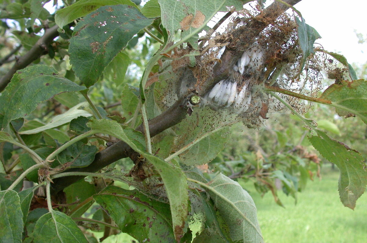 Im vergangenen Sommer wurden in vielen Apfelbäumen Gespinste der Apfelgespinstmotte festgestellt. Die Jungraupen verursachen an den Knospen den ersten Fraßschaden, den sie dann bis zum Sommer als ausgewachsene Raupe an den Blättern weiterführen. Das kann bis zum völligen Kahlfraß eines Baums führen. Ein vitaler Baum kann diesen Verlust stellenweise ausgleichen. Allerdings kommt bei mehrjährigem starken Befall jede Pflanze an ihre Grenzen. Zudem können weiteren Faktoren wie Hitze und Wassermangel zu erheblichen Beeinträchtigungen führen. Deshalb: kontrollieren.