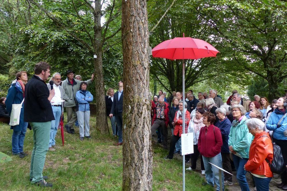 Florian Rogge trägt unter den Ginkgos Goethes Gedicht über diesen besonderen Baum vor, hinter ihm Alexandra Kehl, daneben – mit rotem Schirm, aber nicht aufgespannt – Herbert Beilschmidt. FOTO: WEBER