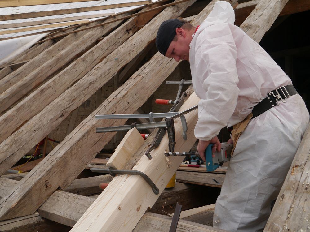 Stück für Stück ersetzt Handwerker Oliver Hornung die maroden Dachsparren. FOTO: ALEXANDER SCHMID