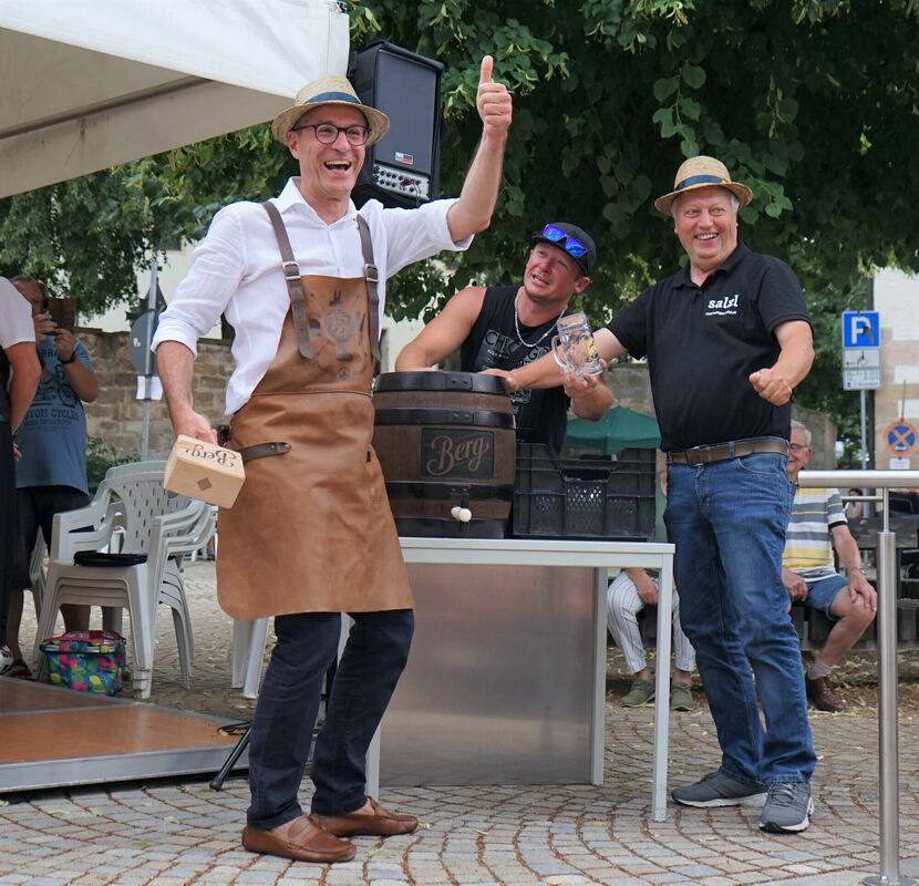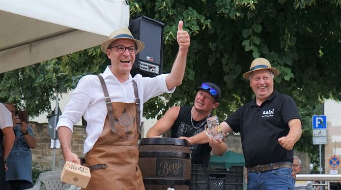 KIRCHENTELLINSFURT. Nach fünf Jahren endlich wieder ein Dorfstraßenfest in Kirchentellinsfurt – das war am Samstag von vielen Leuten zu hören. Nach einem heißen Nachmittag zogen just um 17 Uhr zum offiziellen Fassanstich für das Dorfstraßenfest allerdings dunkle Wolken am Himmel auf. Bürgermeister Bernd Haug: »Jetzt müssen wir uns beeilen.« Denn vor fünf Jahren war zuerst kein Fass da und später regnete es. Diesmal hielt das Wetter noch eine Weile, bis es tröpfelte und später der Regen einsetzte und Haug erwies sich als routiniert: Nach zwei gekonnten Schlägen floss das Freibier. Der Musikverein unter Leitung von Patrick Maisch stimmte »Ein Prosit« an. »Der Fassanstich hat eigentlich noch nie so richtig geklappt«, rief Haug erfreut und gab das Bier an die hundert umstehenden Leute aus. Otto Salzl aus der österreichischen Partnergemeinde Illmitz half beim Ausschenken und Verteilen der Krüge. »Wir hatten mit Corona eine lange, schwere Zeit und können nun wieder zusammenkommen«, sagte Haug. »Wir freuen uns auf gute Gespräche, gute Laune und viel Musik.« Das Dorfstraßenfest sei fraglos eines der Highlights. Haug hob das Kinder- und Jugendprogramm hervor und dankte dem Organisationsteam sowie den zahlreichen beteiligten Vereinen.