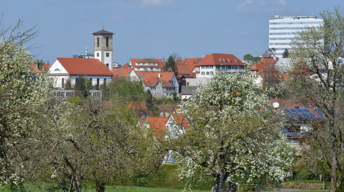 Gomaringens drei Wahrzeichen – Kirche, Schloss und Naturana-Hochhaus – mit unbebauter Streuobstwiesenfläche davor. Zusammen mit Mössingen liegt Gomaringen im unteren Mittelfeld bei den Richtwerten. FOTO: MEYER
