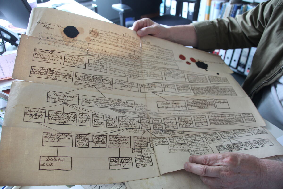 TÜBINGEN. Pergamenturkunden mit Siegeln, Stammbäume, Briefe, Postkarten, Landkarten, Fotografien - Kreisarchivar Wolfgang Sannwald breitet sie auf einem Tisch aus. Aus seinem Familienarchiv hat der Tübinger Klaus Mohr ganze 40 Kartons voller historischer Dokumente gespendet. Sie reichen vom 15. bis zum 20. Jahrhundert und erzählen aus dem Leben einer »Familie der württembergischen Ehrbarkeit«. Der Familie Mohr wurde 1600 das Adelsprädikat »de Sylva« vom österreichischen Kaiser verliehen.