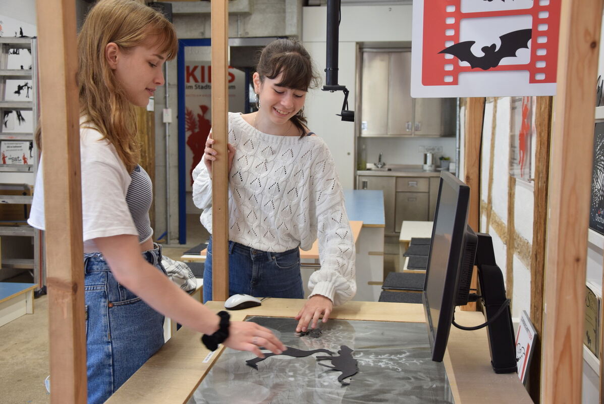 Ein Kunstführer von Jugendlichen: Marie Helene Baten (links) und Laura Steinmayer-Lopez von der GSS Tübingen demonstrieren am Schneidetisch im Stadtmuseum, wie einige der Filme aus Scherenschnitten entstanden sind. FOTO: STÖHR