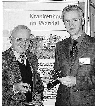 Medizinische Instrumente wie Wundhaken und Knochenzange, die Rainward Bastian (links) und Johannes-Martin Hahn in Händen halten, verschaffen neben Fotografien und Infotafeln einen Eindruck von Tropenmedizin in der Vergangenheit.
