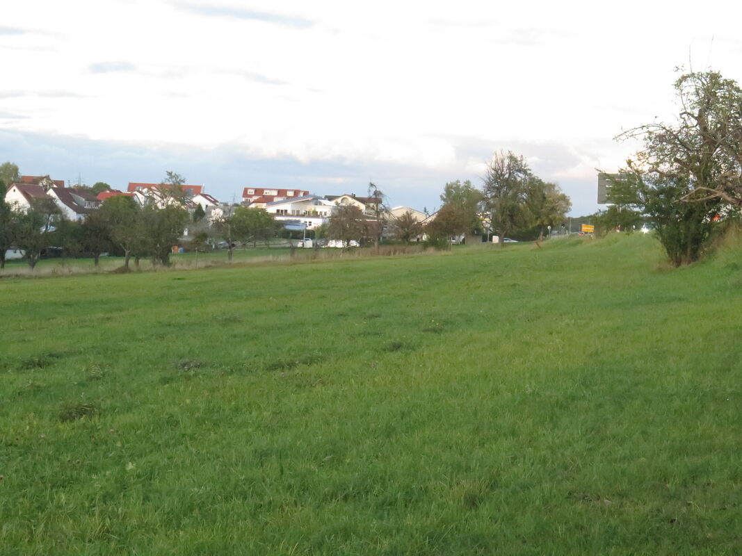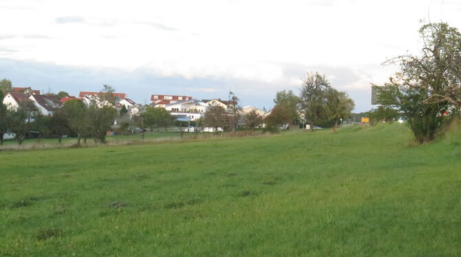 Die Untere Halde Nord in Gomaringen: ein drei Hektar großes Baugebiet zwischen der Landesstraße nach Reutlingen (rechts), dem Gewerbegebiet Krautländer (Hintergrund) und den Häusern an der Grundstraße (links). Foto: Förder
