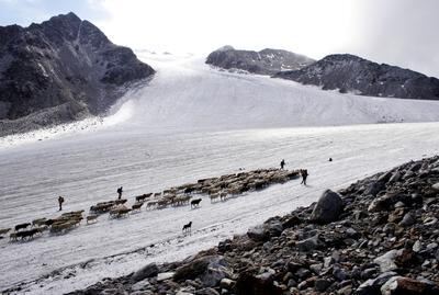 In über 3000 Metern Höhe müssen Hirten und Herde den Gletscher überqueren, um zu den Weidegebieten zu gelangen.