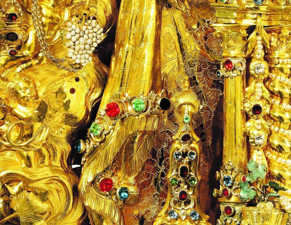 Monumentales Schaugefäß: Detail der Augsburger Hostienmonstranz von 1755 aus dem Rottenburger Domschatz, Silber, vergoldet, Halbedelsteine. FOTOS: JOACHIM FEIST