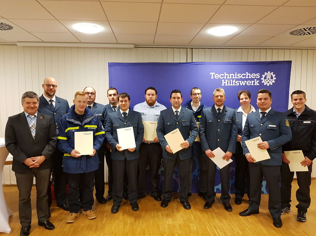 Ehrungen beim THW Ofterdingen in Nehren (von links): Bürgermeister Egon Betz, Bastian Kuppinger, Bernd-Martin Sigmann, Harald Schwertle, Stefan Niedzwetzki, Steffen Mast, Florian Schwertle, Michael Leuthe, Matthias Berndorfer, Peter Priester, Andrea Klein, Steffen Höfs, Julian Scheufele. FOTO: THW