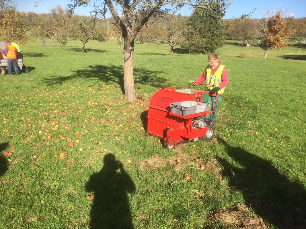 Robert Butsch von der Grünen Gruppe des Freundeskreises wurde extra an der Apfellesemaschine eingelernt und macht einen hervorragenden Job. FOTO: FREUNDESKREIS