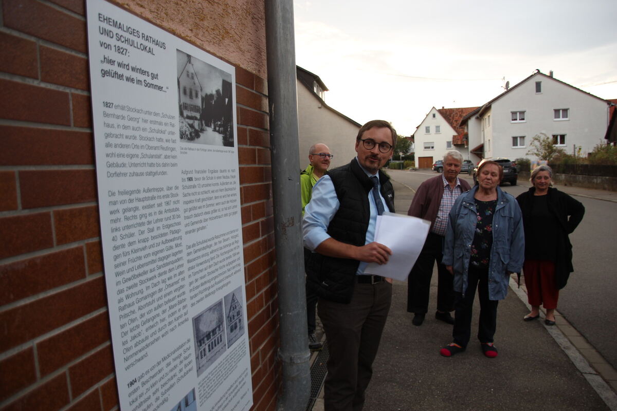 Bürgermeister Heß (links) erläutert die neue Station des Geschichtspfads am alten Stockacher Rathaus; hinten rechts die heutigen Besitzer Uwe und Heidelinde Beier. FOTO: FÖRDER