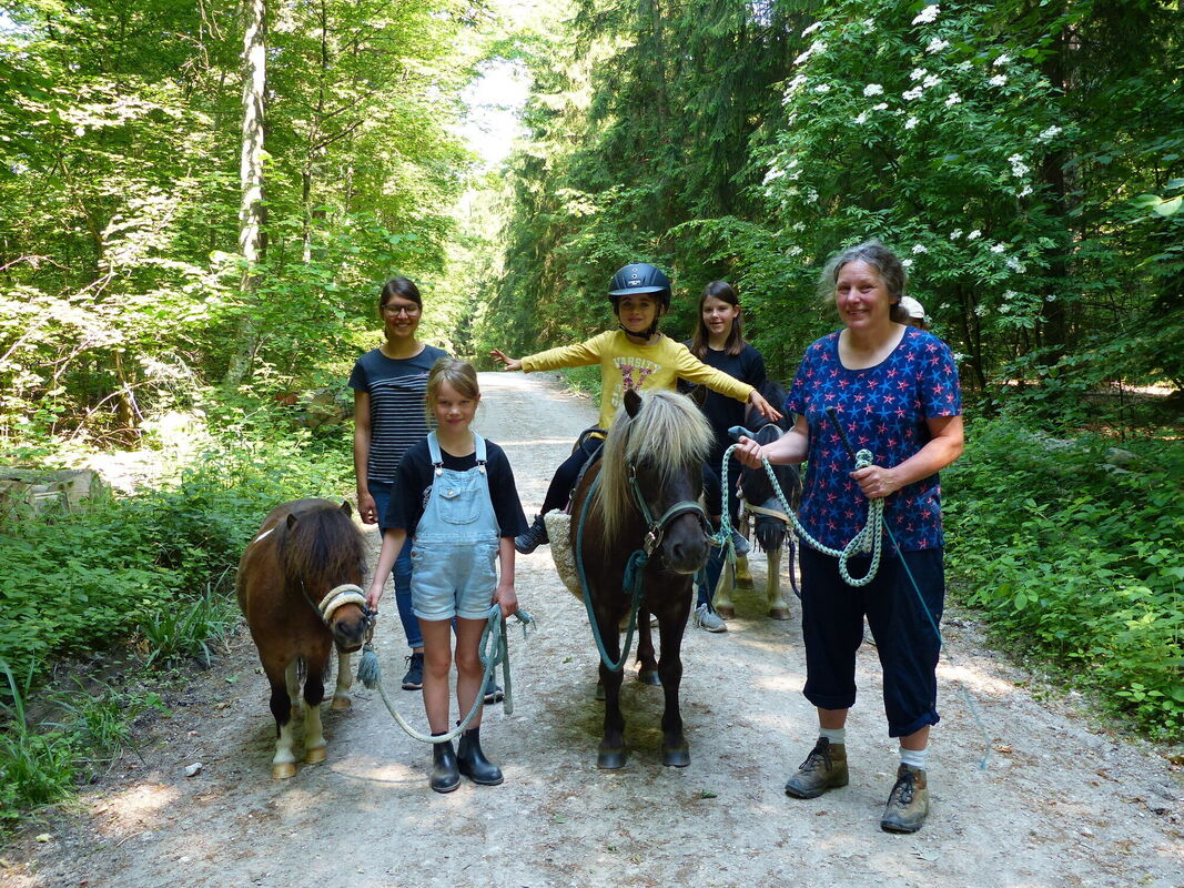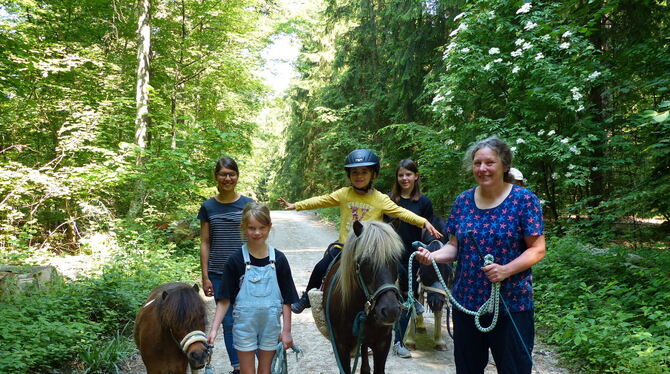 Nora strahlt, sie kann freihändig auf dem Rücken von Donner Balance halten. Die Gomaringer Reittherapeutin Brigitte Fetzer (rechts) hält das Pony an der Leine. FOTO: WEBER