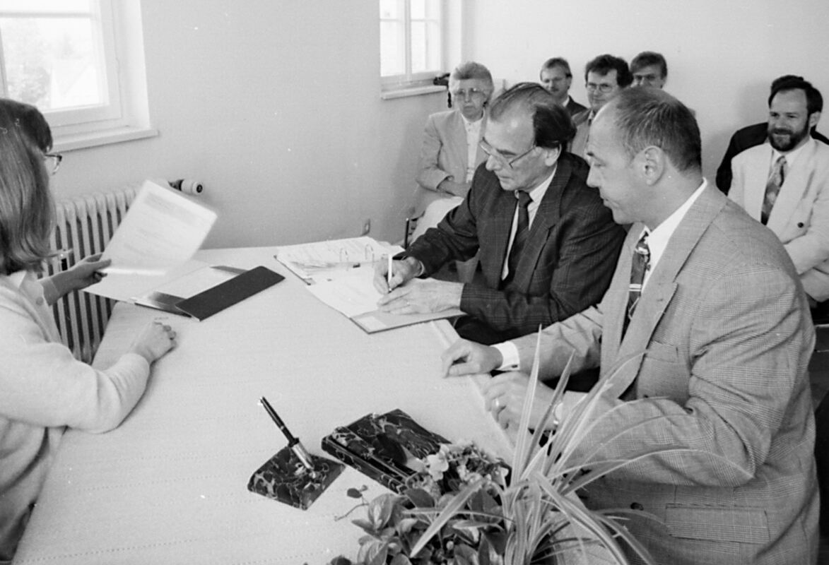 Ein historischer Moment in der Gomaringer Geschichte: Bürgermeister Manfred Schmiderer (rechts) und Hans-Jörg Ehret, Leiter des Staatlichen Liegenschaftsamts Tübingen, unterzeichnen am 31. Mai 1994 den Kaufvertrag für das Gomaringer Schloss. FOTO: MEYER