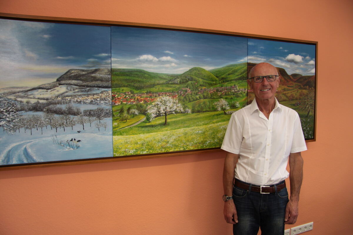 Gottlob Heller hört nach zehn Jahren als Talheimer Ortsvorsteher und 39 Jahren als Mitglied des Ortschaftsrats auf. Zudem saß der heute 69-Jährige fünf Jahre für die FWV im Mössinger Gemeinderat. Hier steht er im Büro vor dem Talheimer Jubiläumstriptychon von Rainer Wolfgang Gülch, eine Ortsansicht nach Jahreszeiten. FOTO: MERKLE