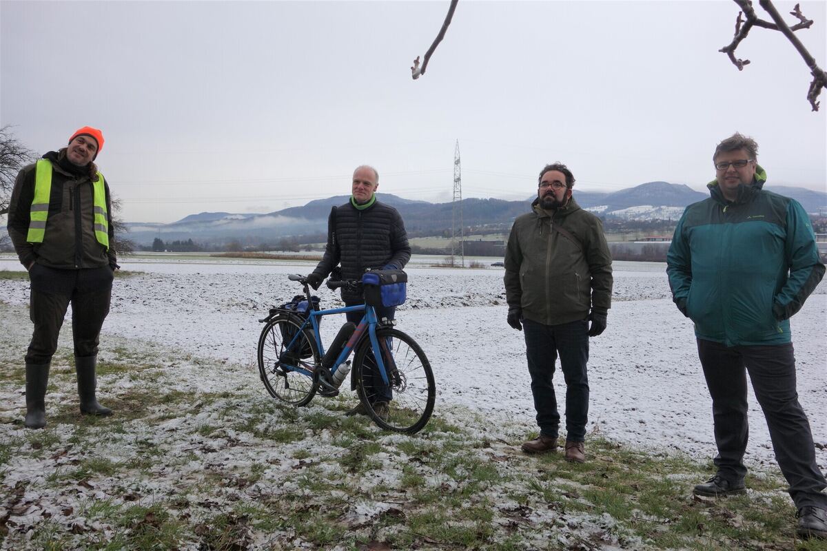 Alexander Ott von der Bürgerinitiative, die Grünen-Abgeordneten Thomas Poreski, Chris Kühn und Daniel Lede Abal sehen sich den Trassenverlauf an. Etwa wo der Strommast im Hintergrund steht (zwischen Ofterdingen und Nehren) soll die neue Bundesstraße verlaufen.